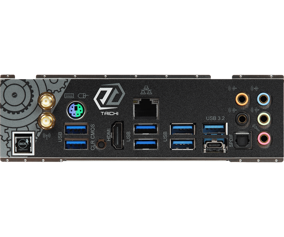 Kết nối mặt sau : | - 2 x Antenna Ports - 1 x PS/2 Mouse/Keyboard Port - 1 x HDMI Port - 1 x Optical SPDIF Out Port - 1 x USB 3.2 Gen2 Type-A Port (10 Gb/s) (Supports ESD Protection) - 1 x USB 3.2 Gen2 Type-C Port (10 Gb/s) (Supports ESD Protection) - 6 x USB 3.2 Gen1 Ports (Supports ESD Protection)* - 1 x RJ-45 LAN Port with LED (ACT/LINK LED and SPEED LED) - 1 x Clear CMOS Button - 1 x BIOS Flashback Button - HD Audio Jacks: Rear Speaker / Central / Bass / Line in / Front Speaker / Microphone (Gold Audio Jacks) |