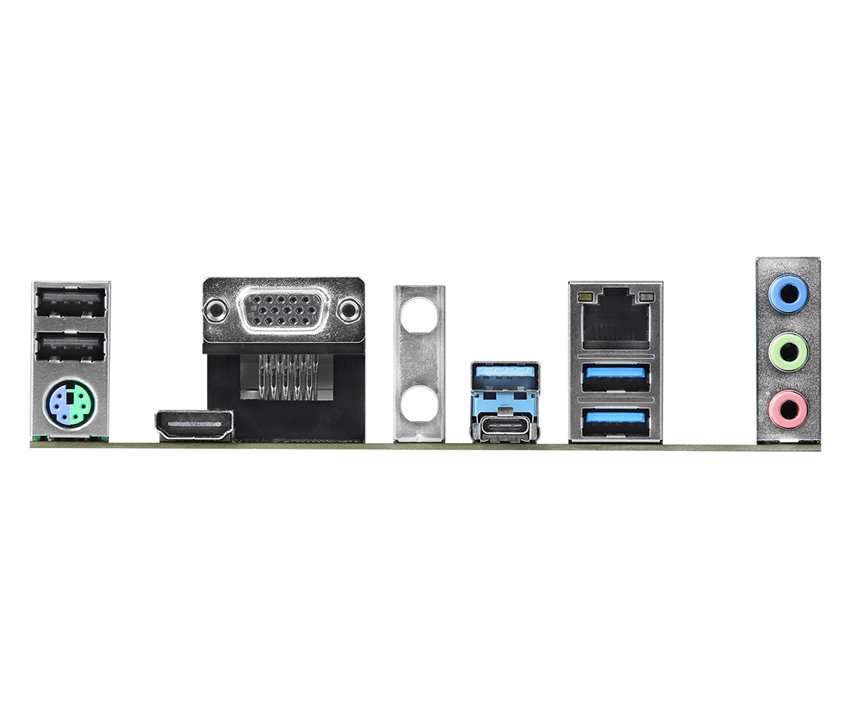 | Rear Panel I/O | - 2 x Antenna Ports - 1 x PS/2 Mouse/Keyboard Port - 1 x D-Sub Port - 1 x HDMI Port - 1 x USB 3.2 Gen2 Type-A Port (10 Gb/s) (ReDriver) (Supports ESD Protection) - 1 x USB 3.2 Gen2 Type-C Port (10 Gb/s) (ReDriver) (Supports ESD Protection) - 2 x USB 3.2 Gen1 Ports (Supports ESD Protection) - 2 x USB 2.0 Ports (Supports ESD Protection) - 1 x RJ-45 LAN Port with LED (ACT/LINK LED and SPEED LED) - HD Audio Jacks: Line in / Front Speaker / Microphone |