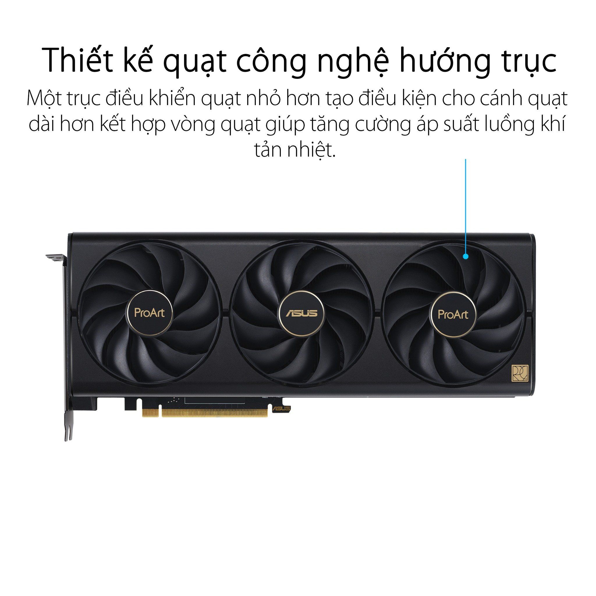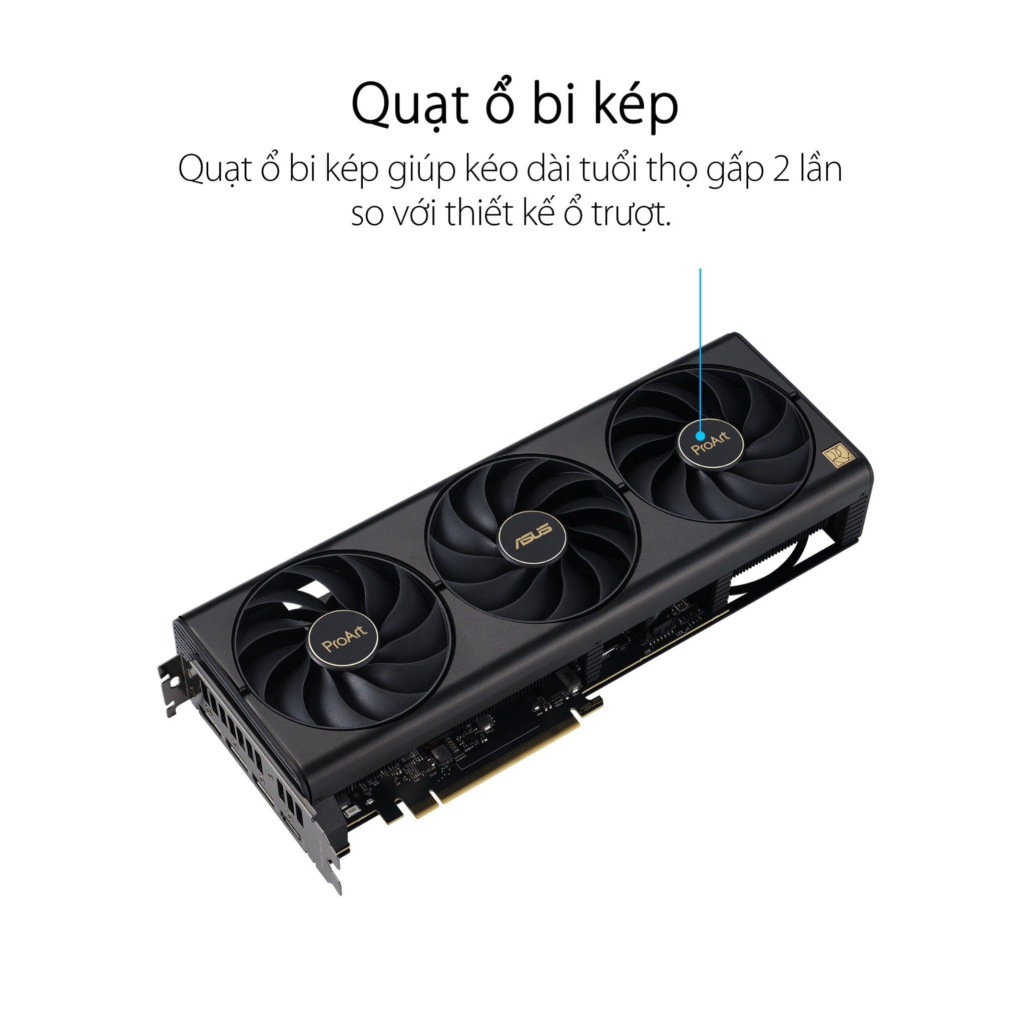 Ba chiếc fan tản nhiệt xuất hiện trên ASUS PROART GeForce RTX 4080 OC Edition được hoàn thiện với công nghệ Axial được điều chỉnh một cách lý tưởng nhất cho khả năng lưu thông luồng gió và áp suất luồng khí tản nhiệt trong tình trạng êm ái. Những chiếc quạt tản nhiệt được hoạt động với ổ bi kép giúp nâng cao tuổi thọ lên gấp đôi so với thiết kế ổ trượt, tạo nên độ uy tín cho tuổi thọ và quá trình hoạt động lâu dài của ASUS PROART GeForce RTX 4080 OC Edition. Và ở sau mặt ốp lưng ấy đó là lỗ thông hơi mang tới hiệu quả làm mát tối đa cho toàn bộ chiếc card màn hình để đem lại hiệu năng xử lý đồ họa bền bỉ nhất cho những dàn PC.