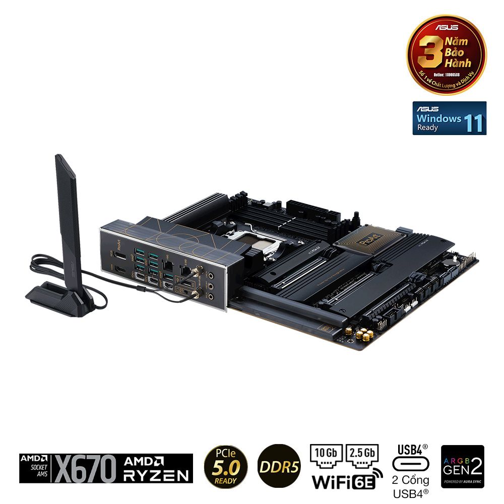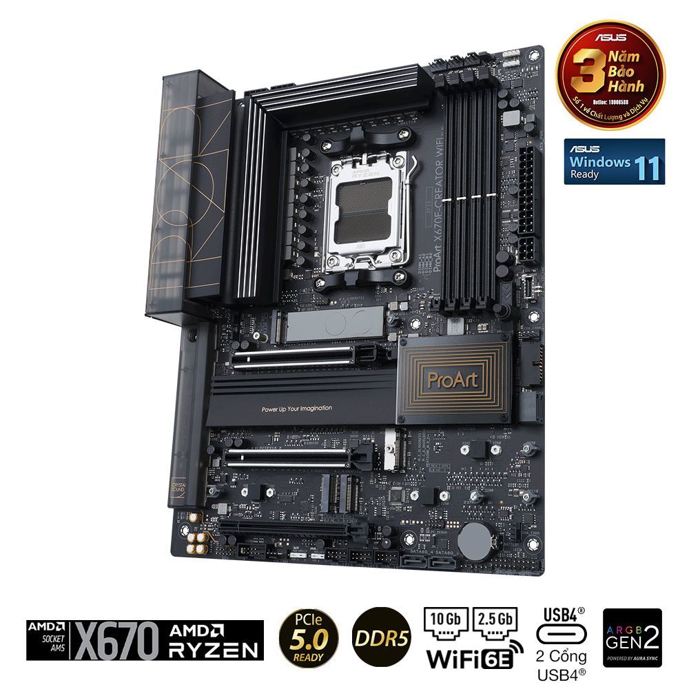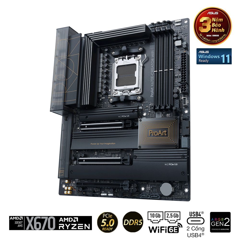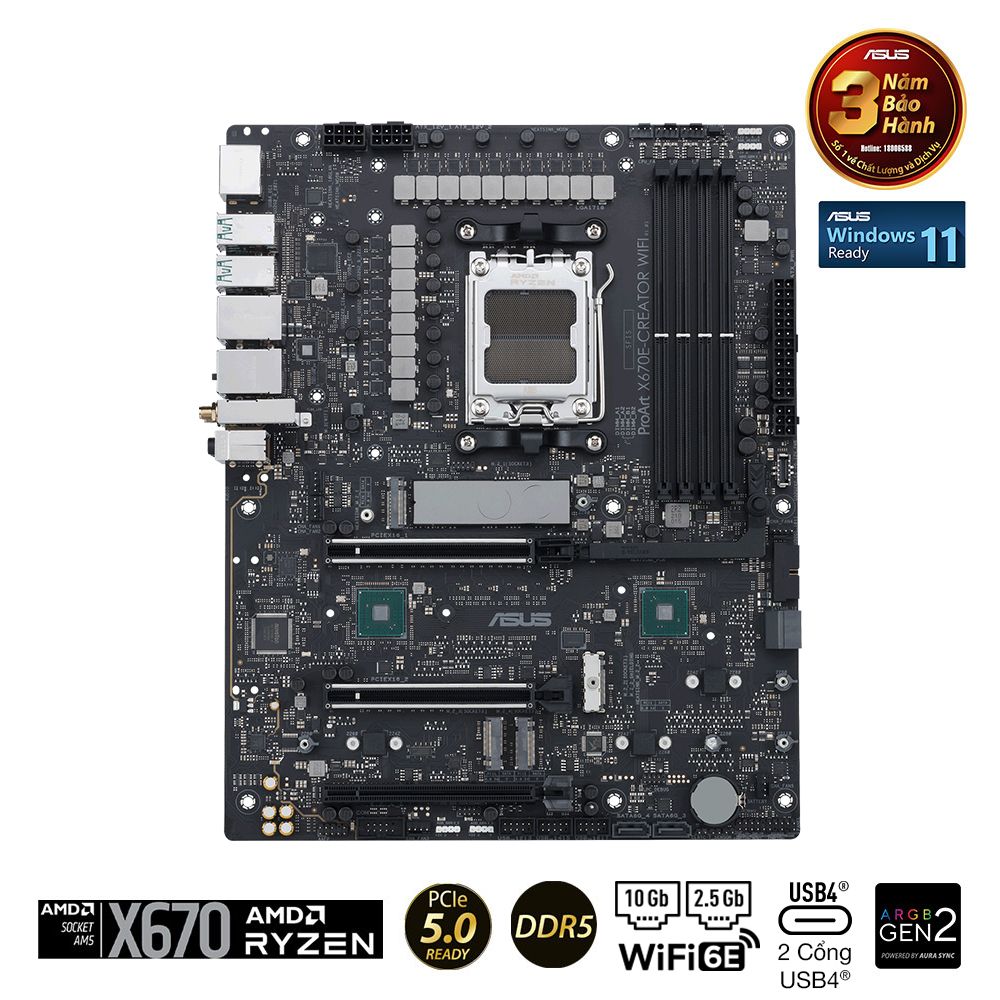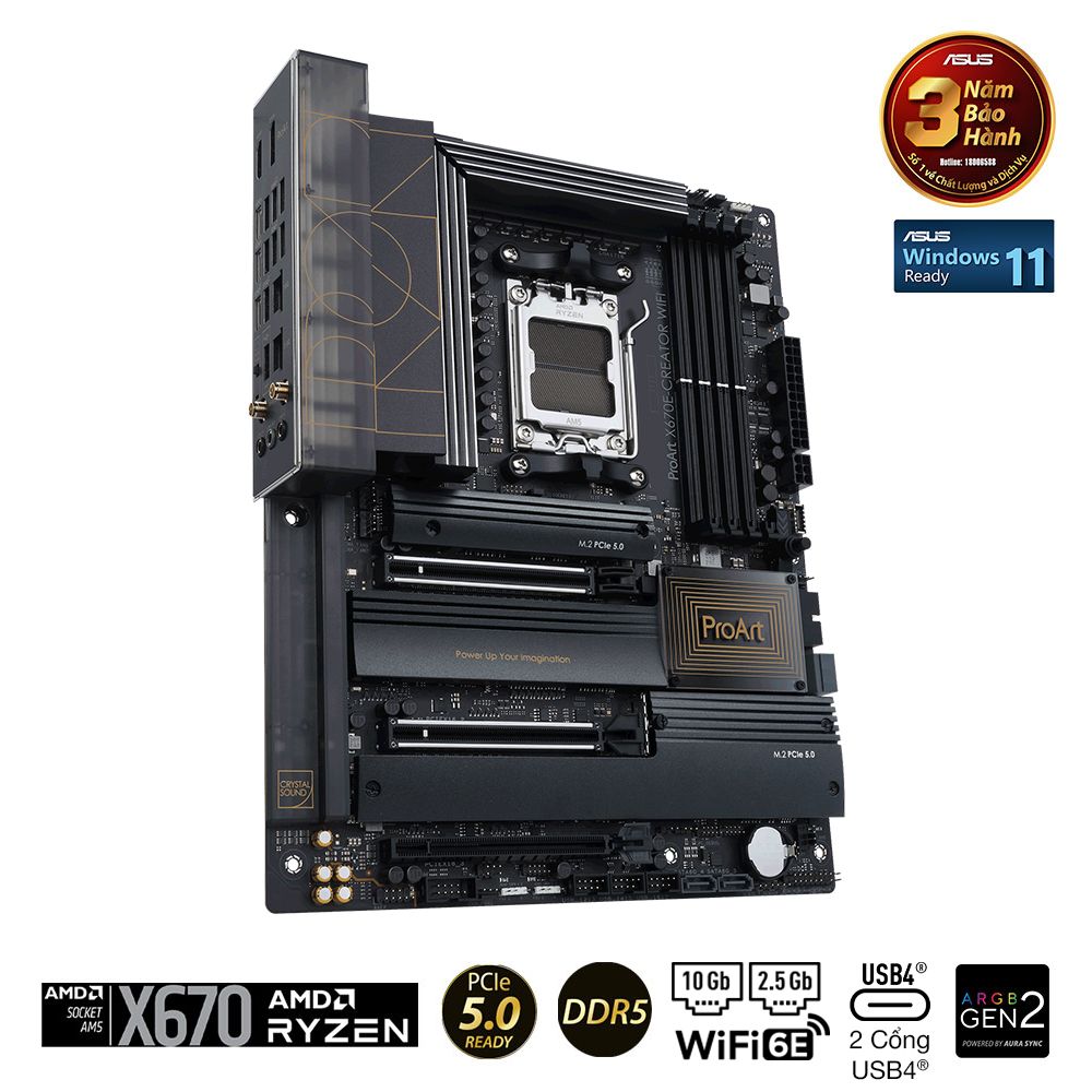 ProArt X670E-Creator WiFi tối đa hóa hiệu suất của bộ vi xử lý AMD Ryzen 7000 Series mới nhất với 16 + 2 cụm power stages, DDR5 và PCIe 5.0 và kết nối nhanh như USB 4, 10 Gb và 2,5 Gb Ethernet, cùng WiFi 6E.