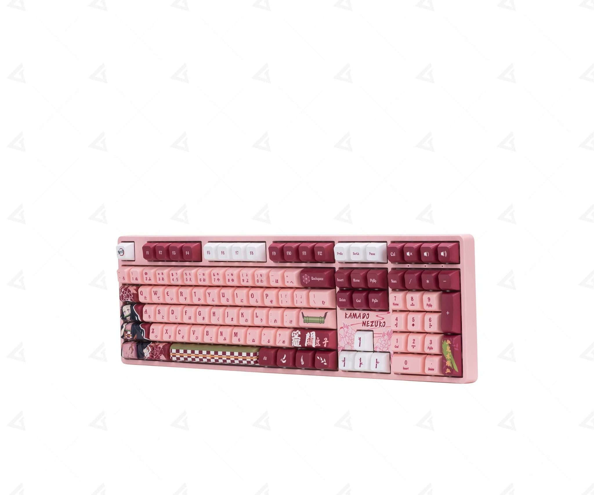 Đặc biệt hơn hết chính là sở hữu thiết kế được lấy cảm hứng từ nhân vật Kamado Nezuko từ bộ truyện Manga, phim hoạt hình Anime nổi tiếng Demon Slayer - Thanh gươm diệt quỷ được kết hợp từ những gam màu hồng Flamingo, đỏ Maroon và trắng tất cả kết hợp lại tạo nên tổng thể bàn phím máy tính vô cùng độc đáo, đầy sáng tạo.