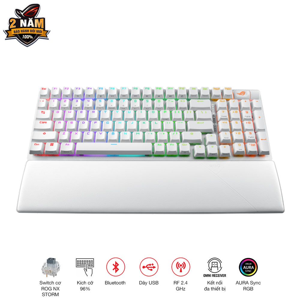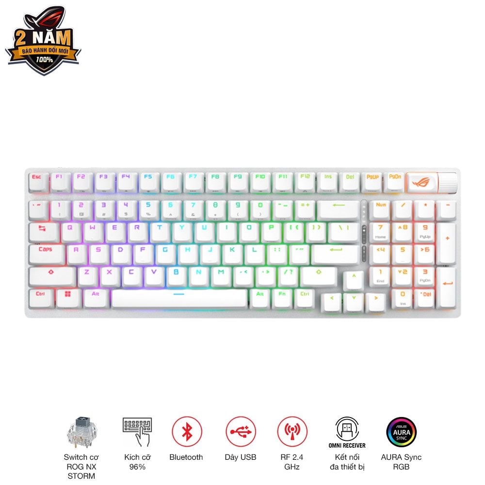 Bàn phím Asus ROG Strix Scope II 96 Wireless được trang bị công tắc cơ ROG NX Storm, nổi tiếng với độ nhạy và khả năng hoạt động êm ái. Công tắc này còn có thể thay nóng, nghĩa là bạn có thể thay thế chúng mà không cần hàn, đồng thời có tùy chọn bôi trơn sẵn để đảm bảo hoạt động mượt mà. Một trong những tính năng mà game thủ yêu thích nhất là đèn LED RGB cho từng phím có thể tùy chỉnh. Bàn phím này tương thích với Aura Sync, cho phép bạn đồng bộ hóa hiệu ứng ánh sáng với các thiết bị khác trong hệ sinh thái của Asus, tạo nên một không gian chơi game rực rỡ và cá tính.