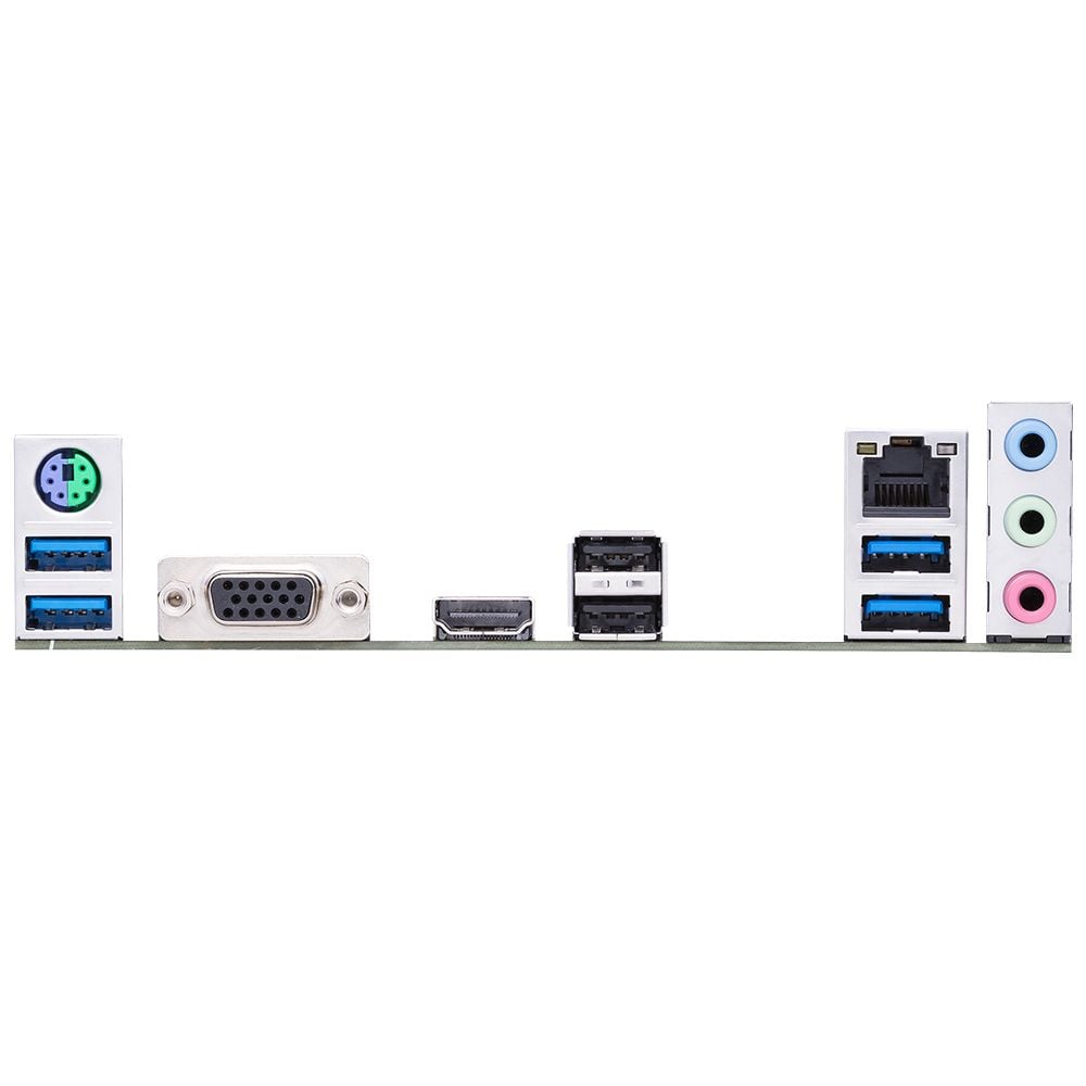 | Cổng I / O phía sau | 1 cổng kết hợp bàn phím / chuột PS / 2 1 x D-Sub 1 x HDMI 1 x cổng LAN (RJ45) 4 x USB 3.1 thế hệ thứ 1 (màu xanh) Kiểu A 2 x USB 2.0 3 x giắc cắm âm thanh |