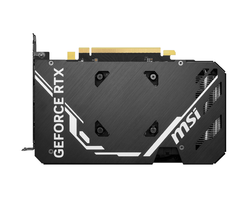 Mặt sau MSI GeForce RTX 4060 Ti VENTUS 2X BLACK 16G OC sẽ là tấm backplate từ nhôm tăng cường khả năng bảo vệ tối đa cho tổng thể của chiếc card màn hình. Hoàn thiện với những chi tiết cùng đường nét tinh tế, tấm backplate góp phần tô điểm cho vẻ đẹp toàn diện của chiếc VGA từ MSI bên trong case máy tính. Ngoài ra, trên tấm backplate là những khoảng không tăng cường cho khả năng lưu thông gió vào trong chiếc card đồ họa.