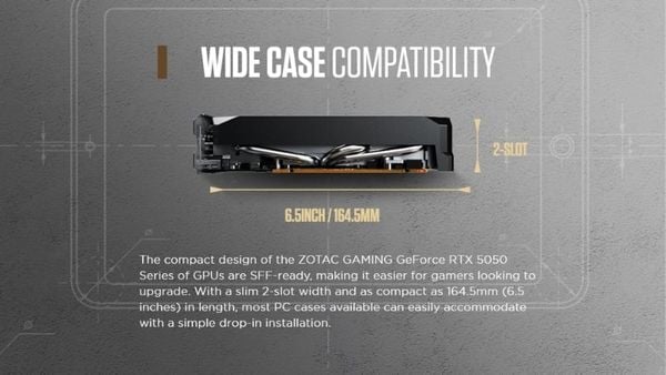 Zotac Gaming GeForce RTX 5050 Twin Edge OC là card đồ họa thuộc dòng Blackwell phân khúc phổ thông. Sản phẩm phù hợp cho chơi game ở độ phân giải 1080p đến 1440p, hỗ trợ công nghệ DLSS 4 giúp tăng tốc độ khung hình đáng kể. Với thiết kế tản nhiệt hai quạt nhỏ gọn, card lý tưởng cho PC mini-ITX, HTPC hoặc các tác vụ như chơi game eSport 240Hz và chỉnh sửa video cơ bản.