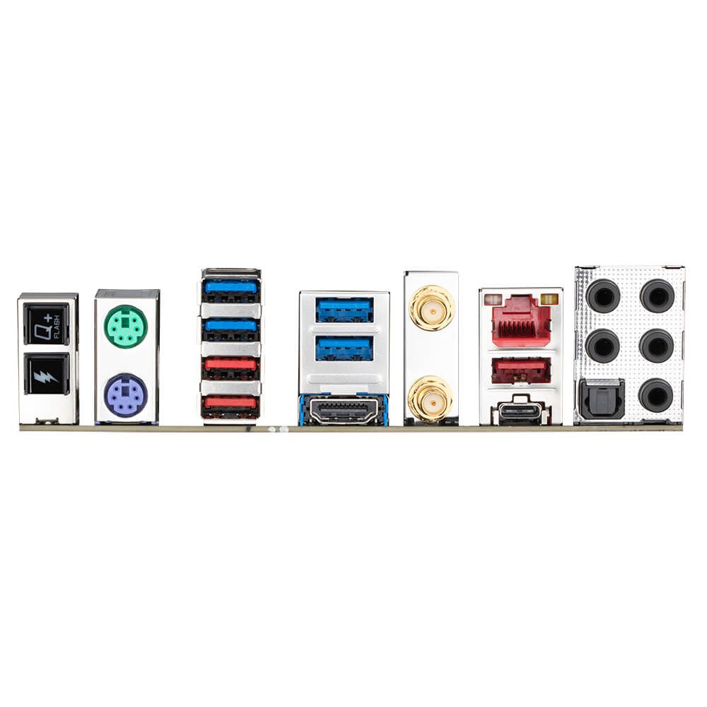 Kết nối mặt sau : | 1 x Q-Flash Plus button 1 x OC Ignition button 1 x PS/2 keyboard port 1 x PS/2 mouse port 2 x SMA antenna connectors (2T2R) 1 x HDMI port 1 x USB Type-C® port, with USB 3.2 Gen 2x2 support 3 x USB 3.2 Gen 2 Type-A ports (red) 4 x USB 3.2 Gen 1 ports 1 x RJ-45 port 1 x optical S/PDIF Out connector 5 x audio jacks |