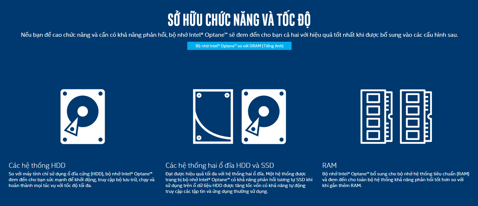 Bộ nhớ Intel® Optane™ và logo của nó truyền tải thông điệp về một tính năng nền tảng, được cấu thành từ các thành phần riêng biệt chứ không phải là một phương tiện bộ nhớ hay ổ đĩa thể rắn có hệ số hình dạng nhỏ duy nhất. Một hệ thống được tích hợp sẵn bộ nhớ Intel® Optane™ gồm có: Bộ xử lý Intel® Core™ thế hệ thứ 7 hoặc mới hơn, chipset chuỗi Intel® 200 hoặc mới hơn, cổng nối 2280-S3-B-M loại M.2 trên bộ điều khiển và làn PCH Remapped PCIe* có cấu hình a x2 hoặc x4 với các khóa B-M đáp ứng thông số kỹ thuật NVMe* Spec 1.1 và BIOS hệ thống hỗ trợ trình điều khiển công nghệ lưu trữ siêu tốc Intel® Rapid Storage (Intel® RST) 15.5 hoặc mới hơn.