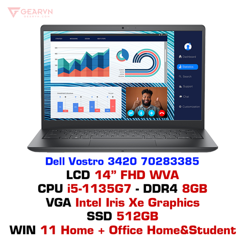 Dell Vostro 3420 được trang bị bộ vi xử lý Intel Core i5-1135G7 thế hệ 11 mới nhất và ổ lưu trữ SSD 512GB giúp bạn xử lý tốt và mượt mà các tác vụ văn phòng cơ bản như Word, Excel, Power Point,...và mang đến khả năng đa nhiệm ấn tượng cho người dùng. Với dung lượng RAM 8GB chuẩn DDR4, laptop còn giúp người dùng có thể vận hành trơn tru nhiều cửa sổ mở cùng lúc và đồ họa chuyển động suôn sẻ. Đồng thời, Dell Vostro 3420 còn hỗ trợ nâng cấp trong tương lai để nâng cấp hiệu năng lên một tầm cao mới.