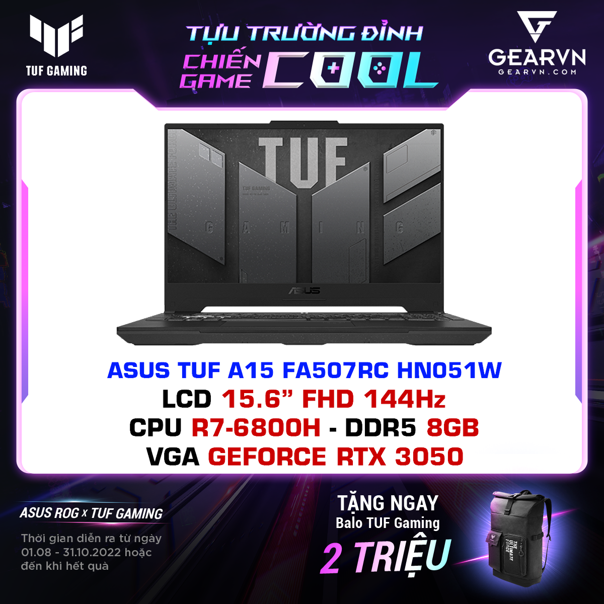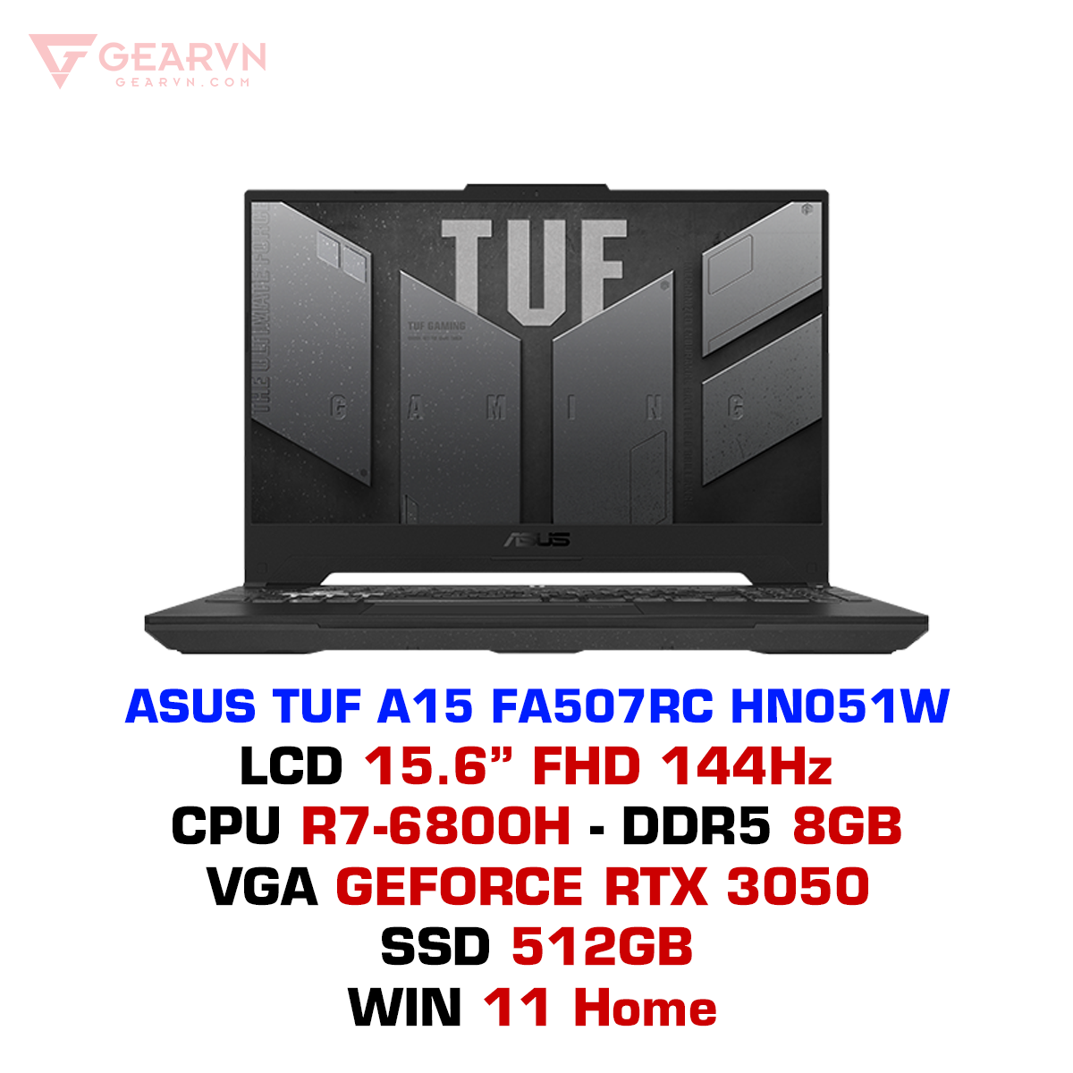 laptop gaming ASUS TUF A15 FA507RC HN051W là sự kết hợp giữ bộ xử lý AMD Ryzen 7 6800H và card đồ họa NVIDIA GeForce RTX 3050 mang đến hiệu năng vượt trội mà ít mẫu laptop nào có được.