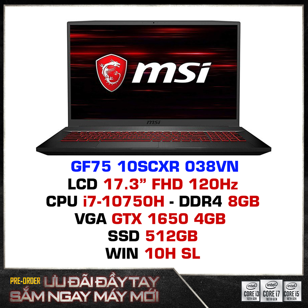 Cấu hình của GF75 Thin 10SCXR 038VN được MSI đầu tư để trở thành chiến binh đúng nghĩa khi so sánh với những sản phẩm khác cùng phân khúc. Với vi xử lý Intel Core i7 thế hệ thứ 10 ( i7-10750H ) cho mức xung nhịp tối đa 5.0 GHz, máy đảm bảo xử lý đầy đủ các tác vụ đa nhiệm nhẹ nhàng cho người dùng mà không gặp phải tình trạng bị đơ máy.