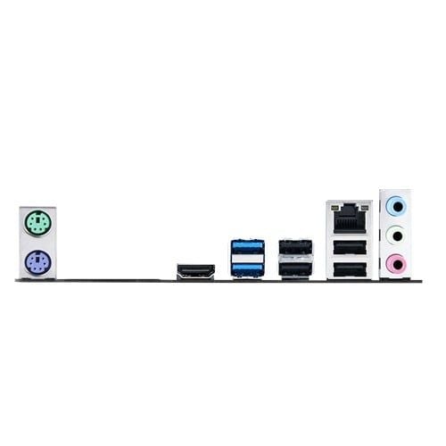 | Back I/O Ports | 1 x PS/2 keyboard (purple) 1 x PS/2 mouse (green) 1 x HDMI 1 x LAN (RJ45) port(s) 2 x USB 3.2 Gen 1 (blue) Type-A 4 x USB 2.0 3 x Audio jack(s) |