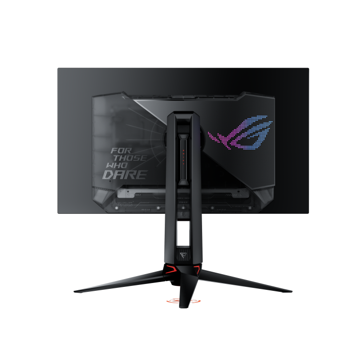Màn hình máy tính Asus ROG Swift PG27AQDP mang phong cách thiết kế đặc trưng của dòng ROG với các đường cắt mạnh mẽ, góc cạnh hiện đại. Thiết kế khung hình tràn viền vừa mang tính thẩm mỹ vừa giúp người dùng tập trung tối đa vào nội dung hiển thị. Chân đế với hình dáng ba chân đảm bảo sự ổn định cho màn hình, đặc biệt Logo ROG còn được chiếu lên cơ sở của màn hình, tăng tính nổi bật cho sản phẩm và phù hợp với mọi góc bố trí.